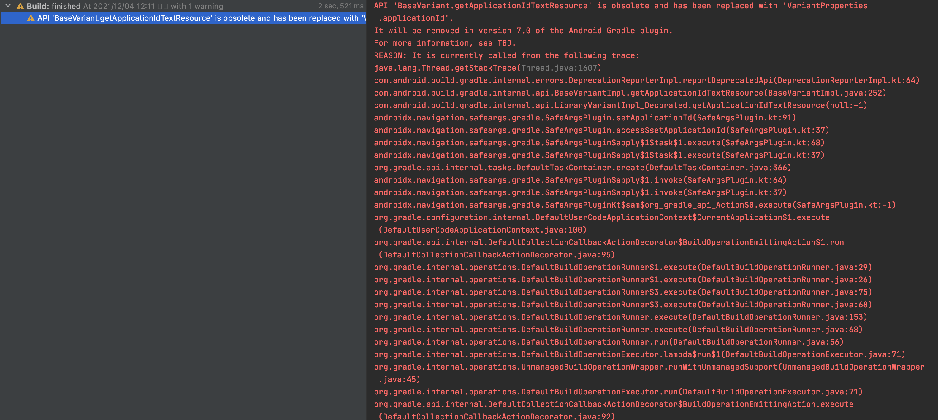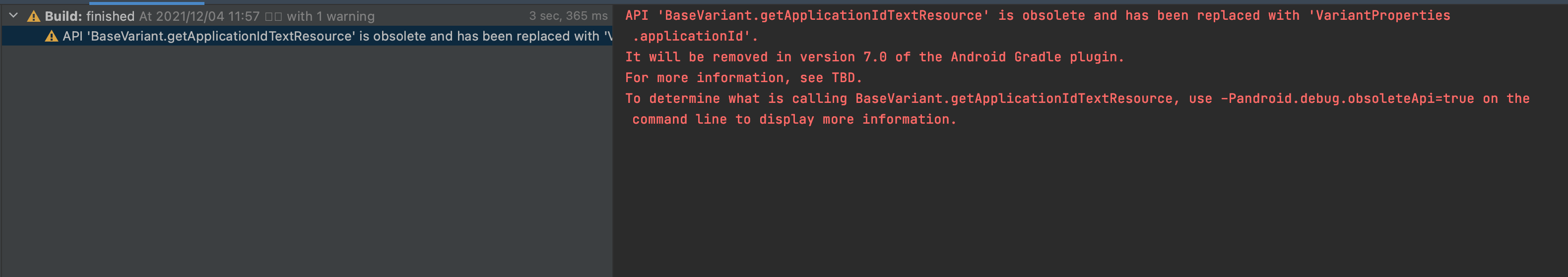 무엇이 BaseVariant.getApplicationIdTextResource을 호출하는지 알아내기 위해, 더 많은 정보를 보여주는 -Pandroid.debug.obsoleteApi = true 을 커맨드라인에 사용해보시기 바랍니다