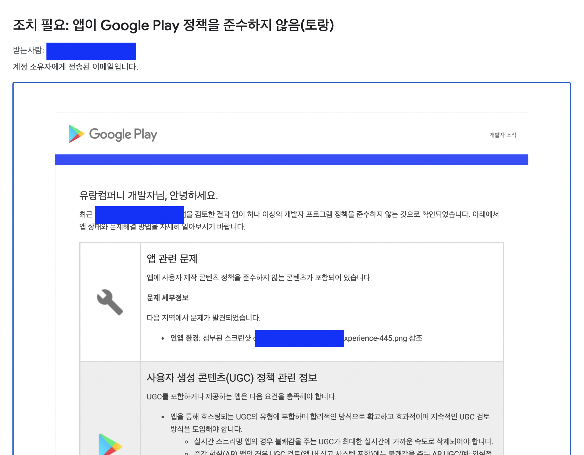 얼마전에 아래와 같은 메일을 받고 올때가 왔구나라고 생각했습니다. 뭔가 걸려서 앱이 짤렸겠거니 생각했는데 다행히 앱이 짤리지는 않았고 업데이트가 거부되었다고 나왔습니다. 구글링을 해본결과 신고기능이 없어서 그런것 같아보여 일단 신고기능을 추가하여 다시 제출해보려합니다.
