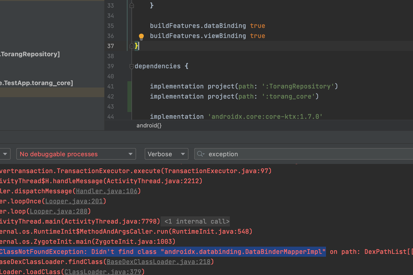 뷰바인딩이 제대로 동작하길래 깜빡했는데 해당 화면에 대한 데이터 바인딩을 build.gradle 파일에 추가했는데도 발생한다면, 현재 실제로 실행하는 앱의 build.gradle에도 추가했는지 확인해야합니다.