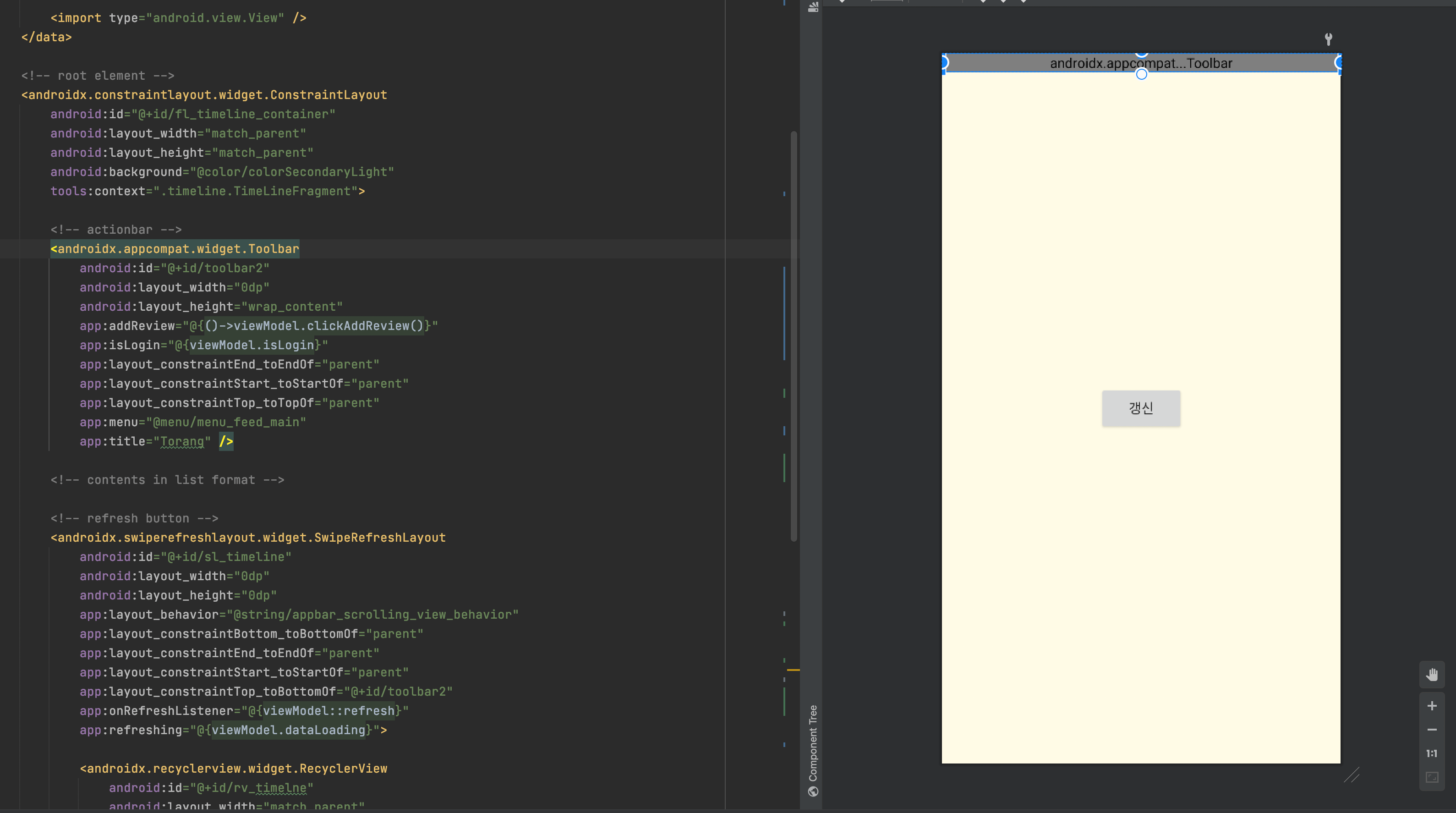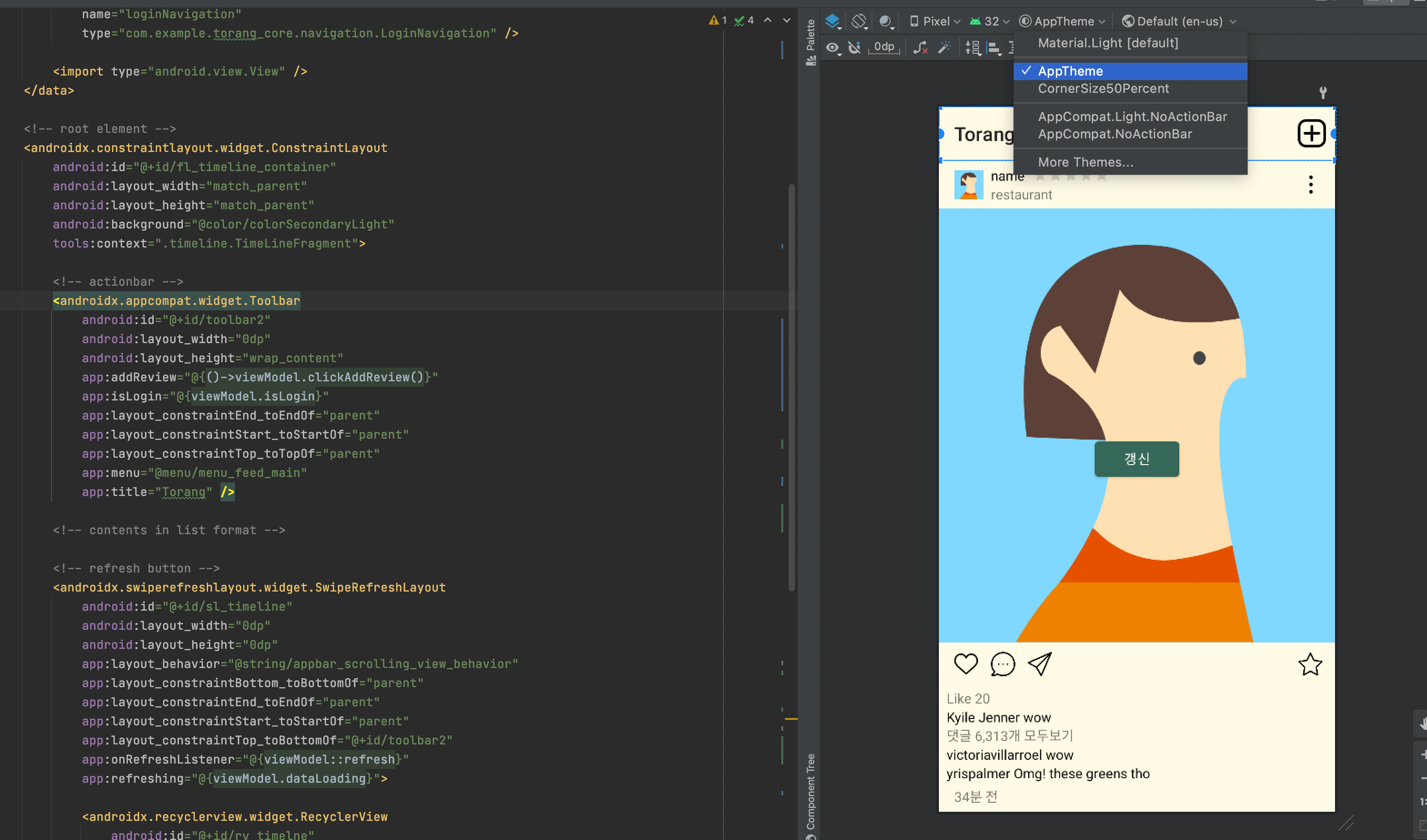 레이아웃에 테마 설정 메뉴가 있는데 이부분을 변경해주니 쉽게 해결되었습니다.