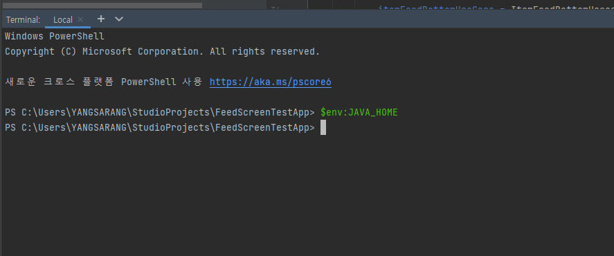 시스템 변수 추가 후 터미널을 다시 실행하면 아래 명령어로 추가한 변수를 확인 할 수 있습니다.