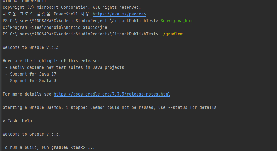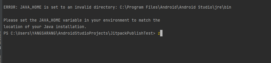 윈도우 안드로이드 스튜디오 터미널에서 gradlew를 실행하니 아래와 같은 오류메시지가 발생하였습니다.