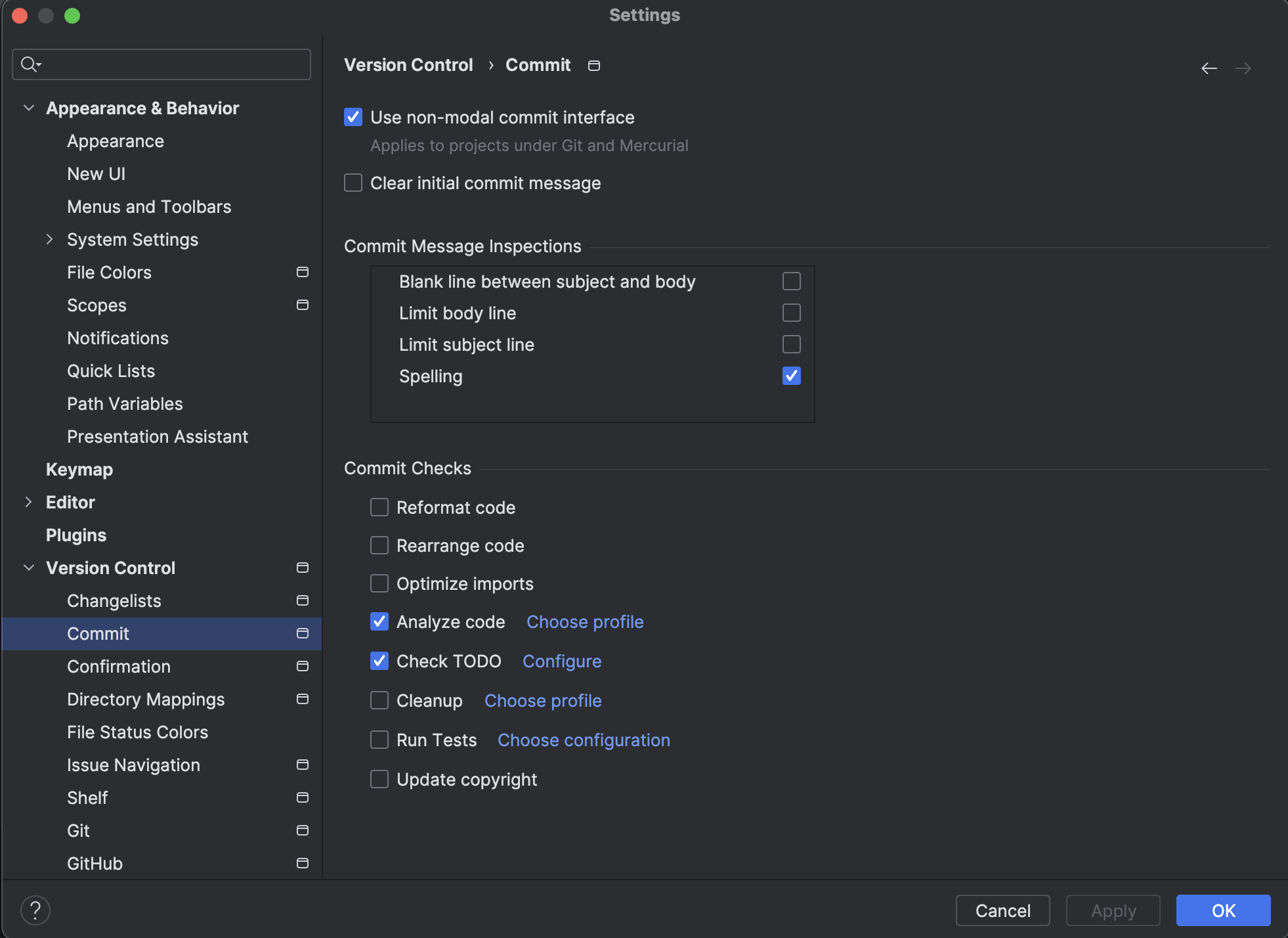 Settings -> Version Control -> Commit -> Analyze code 체크 해제 후 다시 빠르게 커밋 할 수 있었다.
